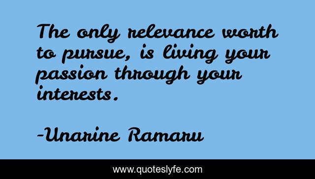 This page presents the quote "The only relevance worth to pursue, is living your passion through your interests.". Author of this quote is Unarine Ramaru. This quote is about character-building, leadership, passion, pursuit, interest, relevance,.