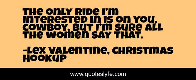 This page presents the quote "The only ride I’m interested in is on you, cowboy, but I’m sure all the women say that.". Author of this quote is Lex Valentine, Christmas Hookup. This quote is about erotica, christmas-hookup, lex-valentine,.