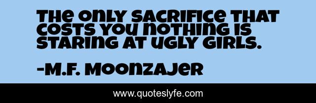 This page presents the quote "The only sacrifice that costs you nothing is staring at ugly girls.". Author of this quote is M.F. Moonzajer. This quote is about ugly, girls, starring,.