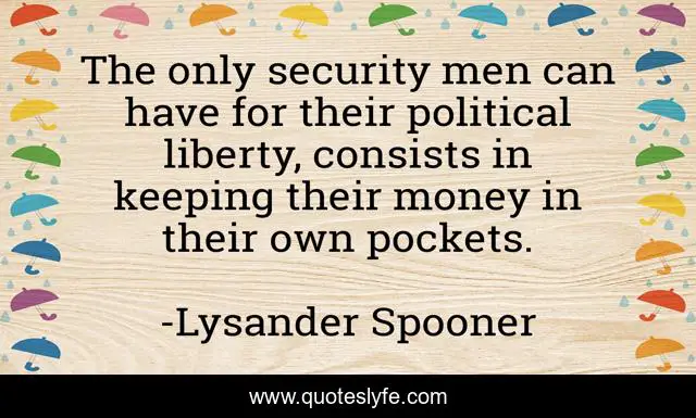 This page presents the quote "The only security men can have for their political liberty, consists in keeping their money in their own pockets.". Author of this quote is Lysander Spooner. This quote is about money, men, political,.