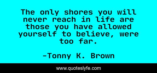 This page presents the quote "The only shores you will never reach in life are those you have allowed yourself to believe, were too far.". Author of this quote is Tonny K. Brown. This quote is about enthusiasm, inspirational,.