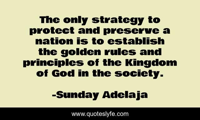 This page presents the quote "The only strategy to protect and preserve a nation is to establish the golden rules and principles of the Kingdom of God in the society.". Author of this quote is Sunday Adelaja. This quote is about kingdom-of-god, golden-rule, society,.