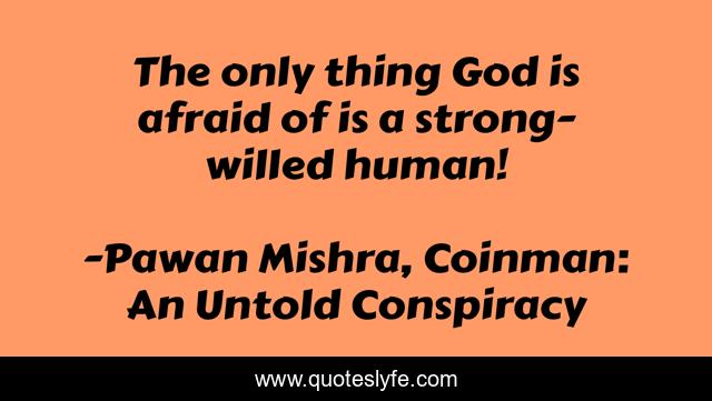This page presents the quote "The only thing God is afraid of is a strong-willed human!". Author of this quote is Pawan Mishra, Coinman: An Untold Conspiracy. This quote is about strong-willed, god, afraid, human, will-power,.