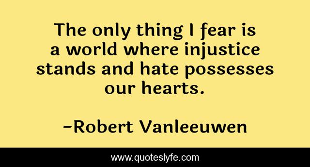 This page presents the quote "The only thing I fear is a world where injustice stands and hate possesses our hearts.". Author of this quote is Robert Vanleeuwen. This quote is about justice, life, hate, injustice, truth,.
