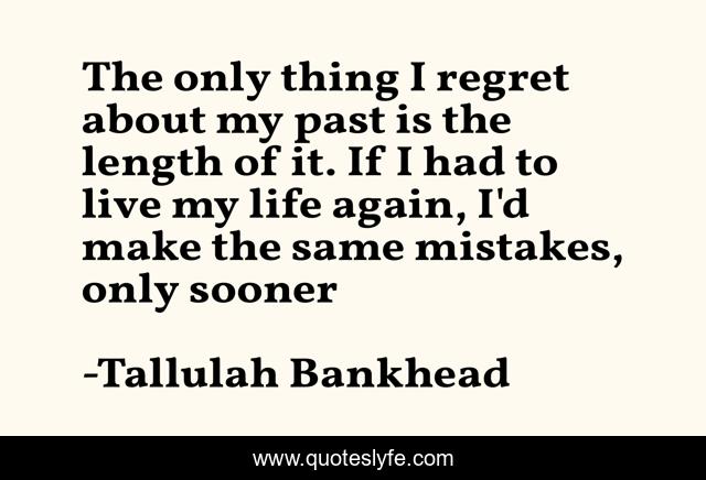 This page presents the quote "The only thing I regret about my past is the length of it. If I had to live my life again, I'd make the same mistakes, only sooner". Author of this quote is Tallulah Bankhead. This quote is about mistakes, regret, life-lessons,.