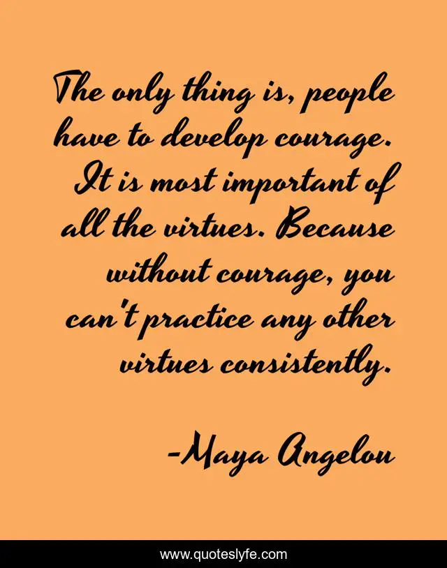 This page presents the quote "The only thing is, people have to develop courage. It is most important of all the virtues. Because without courage, you can't practice any other virtues consistently.". Author of this quote is Maya Angelou. This quote is about practice, people,.