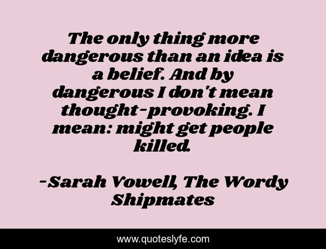 This page presents the quote "The only thing more dangerous than an idea is a belief. And by dangerous I don't mean thought-provoking. I mean: might get people killed.". Author of this quote is Sarah Vowell, The Wordy Shipmates. This quote is about religion, religious-extremism, belief-folly, morality,.