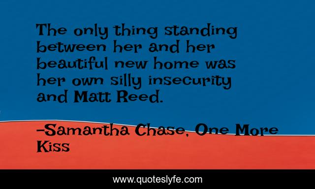 This page presents the quote "The only thing standing between her and her beautiful new home was her own silly insecurity and Matt Reed.". Author of this quote is Samantha Chase, One More Kiss. This quote is about food-blogger-romance, rock-star-romance, contemporary-romance,.
