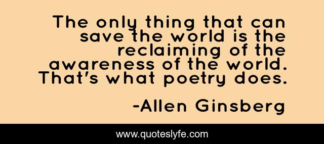 This page presents the quote "The only thing that can save the world is the reclaiming of the awareness of the world. That's what poetry does.". Author of this quote is Allen Ginsberg. This quote is about world, awareness,.