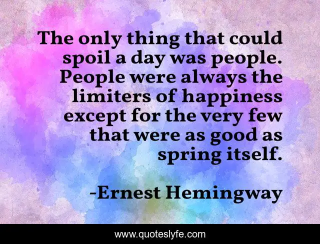 This page presents the quote "The only thing that could spoil a day was people. People were always the limiters of happiness except for the very few that were as good as spring itself.". Author of this quote is Ernest Hemingway. This quote is about spring, good, day,.