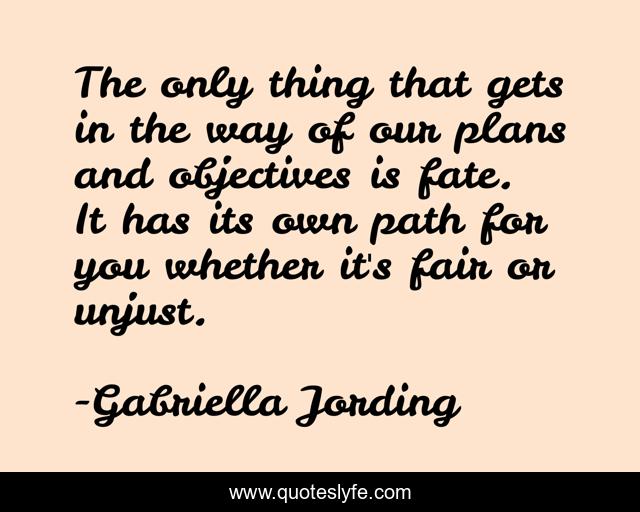 This page presents the quote "The only thing that gets in the way of our plans and objectives is fate. It has its own path for you whether it's fair or unjust.". Author of this quote is Gabriella Jording. This quote is about plans, fate, unjust, objectives, path, fair,.