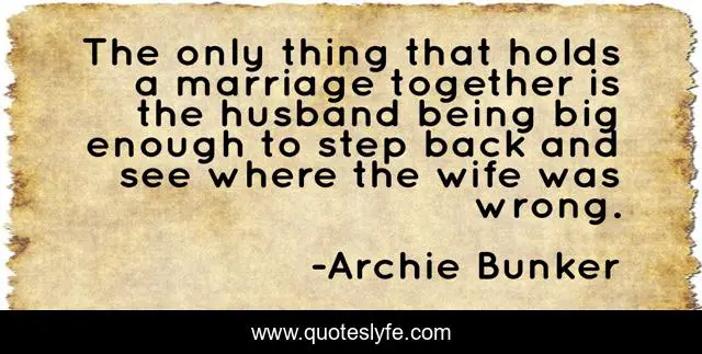 This page presents the quote "The only thing that holds a marriage together is the husband being big enough to step back and see where the wife was wrong.". Author of this quote is Archie Bunker. .