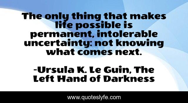 This page presents the quote "The only thing that makes life possible is permanent, intolerable uncertainty: not knowing what comes next.". Author of this quote is Ursula K. Le Guin, The Left Hand of Darkness. This quote is about epistemology, future, philosophy,.