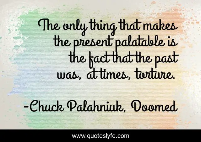 This page presents the quote "The only thing that makes the present palatable is the fact that the past was, at times, torture.". Author of this quote is Chuck Palahniuk, Doomed. This quote is about past, present, torture,.