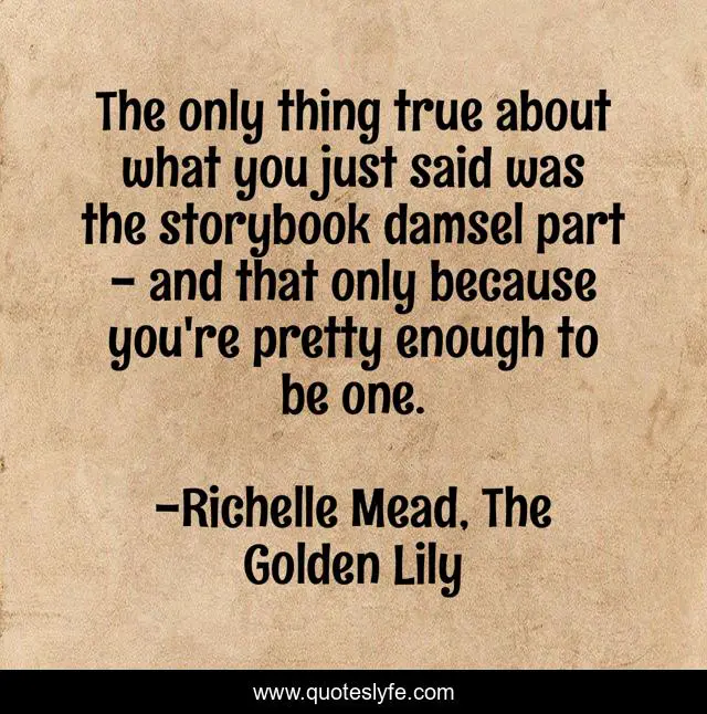 This page presents the quote "The only thing true about what you just said was the storybook damsel part - and that only because you're pretty enough to be one.". Author of this quote is Richelle Mead, The Golden Lily. This quote is about beautiful, damsel-in-distress,.