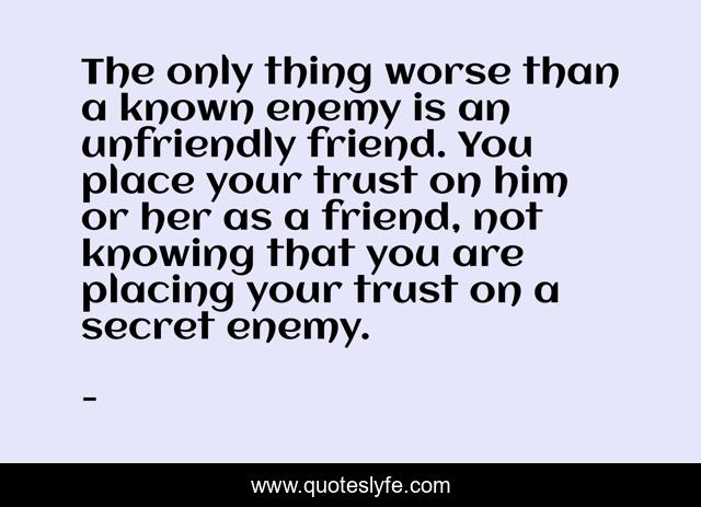 This page presents the quote "The only thing worse than a known enemy is an unfriendly friend. You place your trust on him or her as a friend, not knowing that you are placing your trust on a secret enemy.". Author of this quote is . This quote is about edmond-mbiaka, unfriendly-friend, placing-your-trust, placing-your-trust-on-a-friend, a-known-enemy, secret-enemy,.