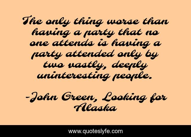 This page presents the quote "The only thing worse than having a party that no one attends is having a party attended only by two vastly, deeply uninteresting people.". Author of this quote is John Green, Looking for Alaska. .