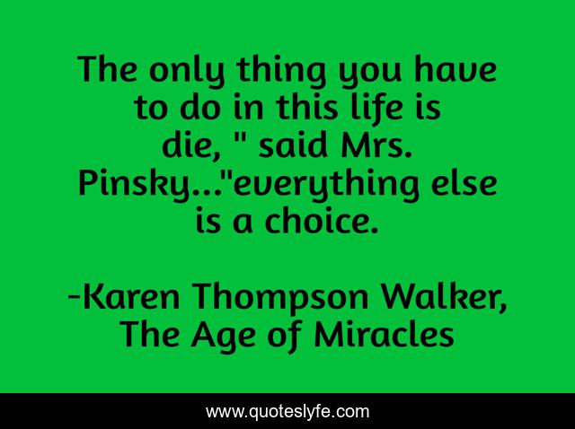 This page presents the quote "The only thing you have to do in this life is die, " said Mrs. Pinsky..."everything else is a choice.". Author of this quote is Karen Thompson Walker, The Age of Miracles. This quote is about life, choice,.