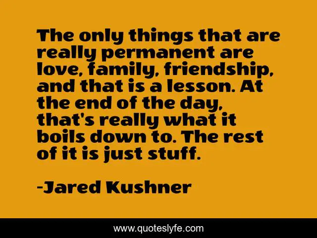 This page presents the quote "The only things that are really permanent are love, family, friendship, and that is a lesson. At the end of the day, that's really what it boils down to. The rest of it is just stuff.". Author of this quote is Jared Kushner. This quote is about family, love, day, affection,.