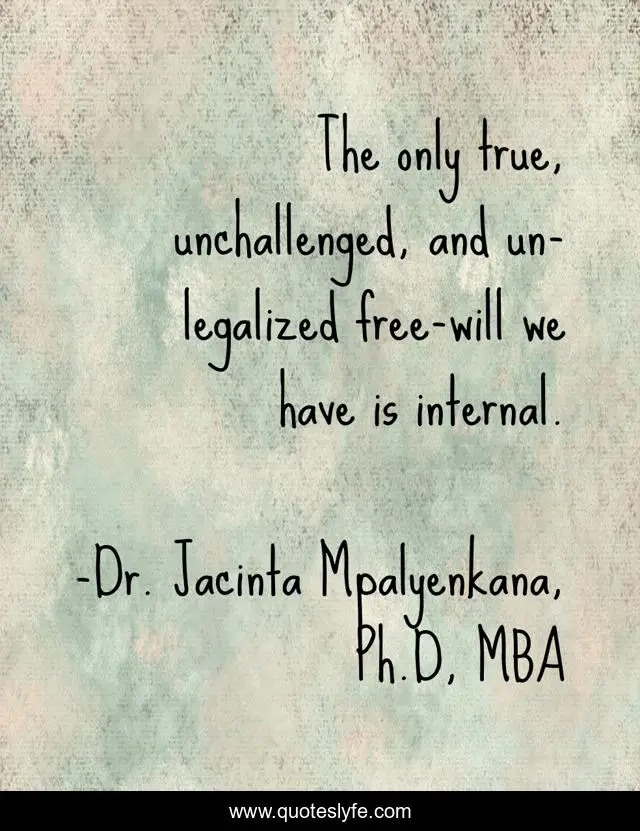 This page presents the quote "The only true, unchallenged, and un-legalized free-will we have is internal.". Author of this quote is Dr. Jacinta Mpalyenkana, Ph.D, MBA. This quote is about freedom, free-will, inner-self,.