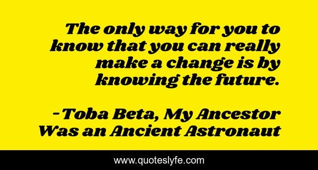 This page presents the quote "The only way for you to know that you can really make a change is by knowing the future.". Author of this quote is Toba Beta, My Ancestor Was an Ancient Astronaut. This quote is about knowing, change-the-world, future, present,.