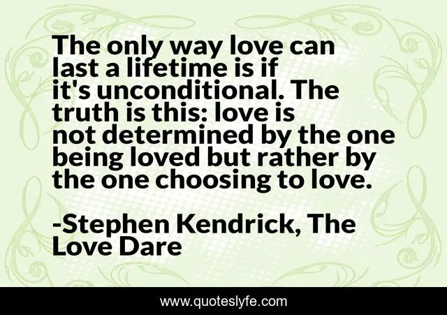This page presents the quote "The only way love can last a lifetime is if it's unconditional. The truth is this: love is not determined by the one being loved but rather by the one choosing to love.". Author of this quote is Stephen Kendrick, The Love Dare. This quote is about love, unconditional-love, marriage, agape, affection,.
