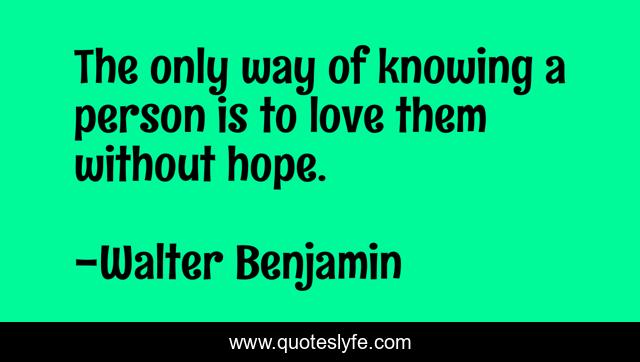 This page presents the quote "The only way of knowing a person is to love them without hope.". Author of this quote is Walter Benjamin. This quote is about love, hope, affection,.