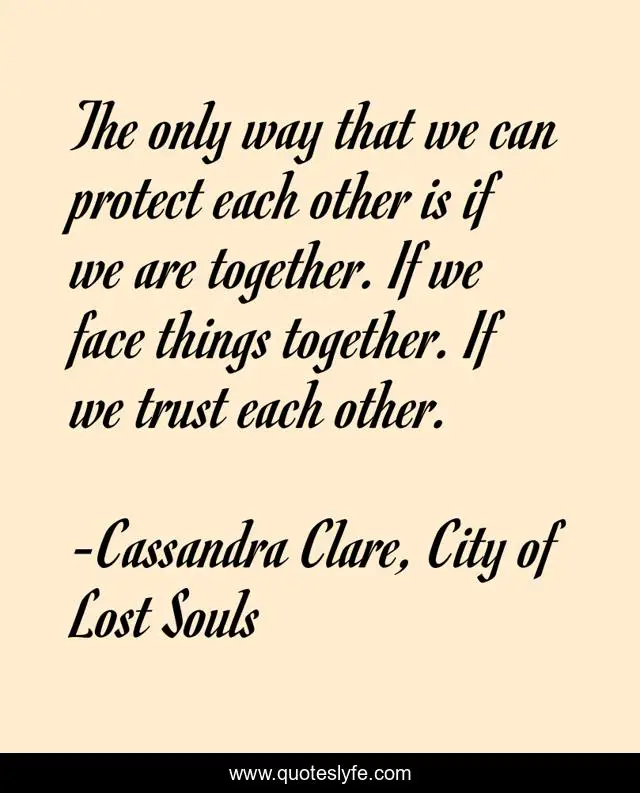 This page presents the quote "The only way that we can protect each other is if we are together. If we face things together. If we trust each other.". Author of this quote is Cassandra Clare, City of Lost Souls. This quote is about trust, love, affection,.