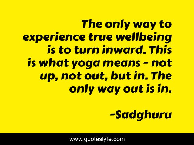 This page presents the quote "The only way to experience true wellbeing is to turn inward. This is what yoga means - not up, not out, but in. The only way out is in.". Author of this quote is Sadghuru. This quote is about yoga, wellbeing, inward-focus,.
