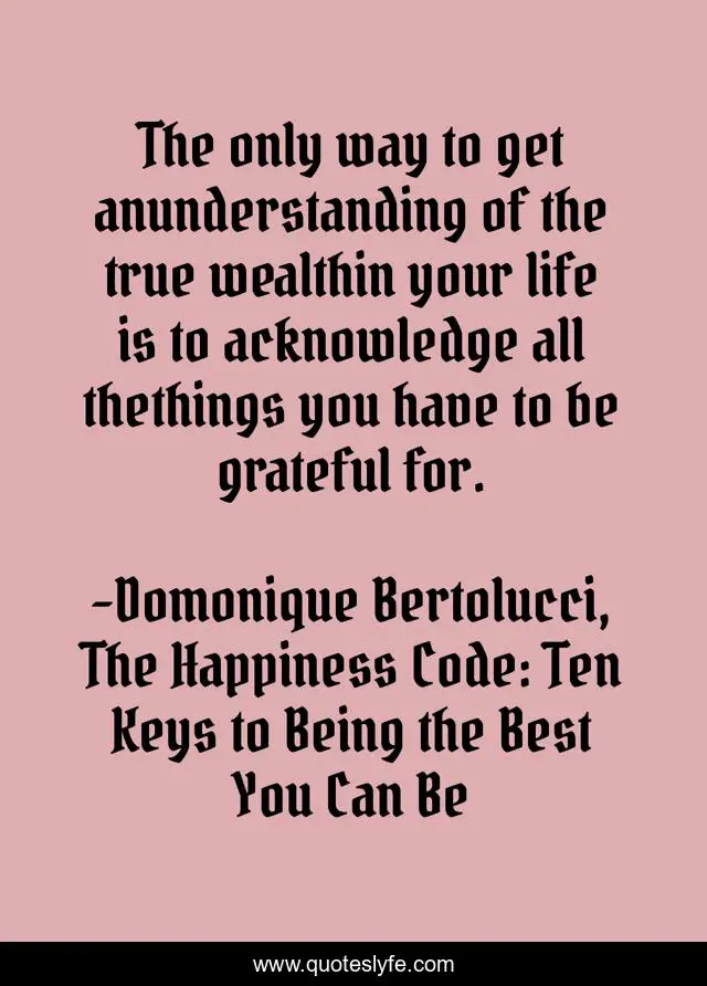 This page presents the quote "The only way to get anunderstanding of the true wealthin your life is to acknowledge all thethings you have to be grateful for.". Author of this quote is Domonique Bertolucci, The Happiness Code: Ten Keys to Being the Best You Can Be. This quote is about life-coaching, motivation, how-to-be-happier, life-coach, be-happy, how-to-be-happy, happiness-advice, happiness, be-more-motivated,.