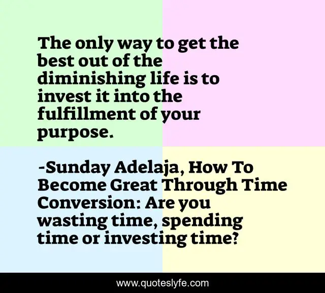 This page presents the quote "The only way to get the best out of the diminishing life is to invest it into the fulfillment of your purpose.". Author of this quote is Sunday Adelaja, How To Become Great Through Time Conversion: Are you wasting time, spending time or investing time?. This quote is about life-investment, product, diminishing-life, calling, investment, conversion, productivity, wealth, greatness,.