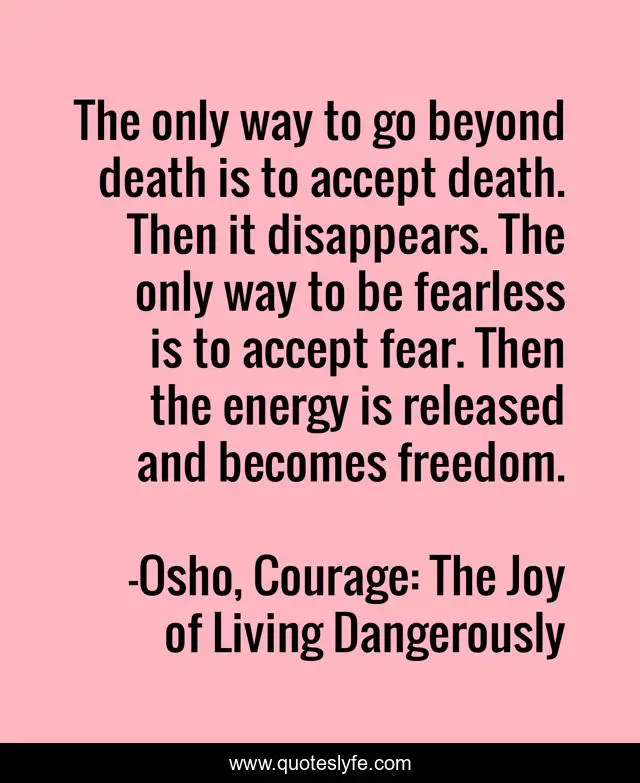 This page presents the quote "The only way to go beyond death is to accept death. Then it disappears. The only way to be fearless is to accept fear. Then the energy is released and becomes freedom.". Author of this quote is Osho, Courage: The Joy of Living Dangerously. This quote is about fearlessness, death, freedom, energy, acceptance, fear,.