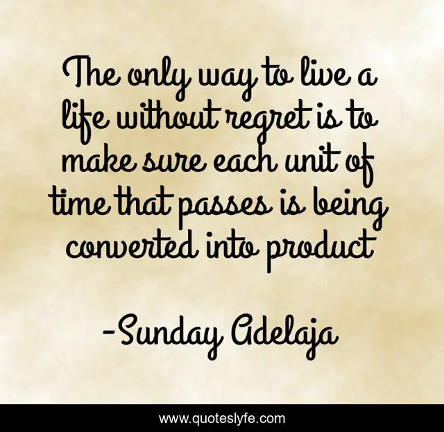 This page presents the quote "The only way to live a life without regret is to make sure each unit of time that passes is being converted into product". Author of this quote is Sunday Adelaja. This quote is about life, productive, productivity, finance, money, blessing, job, joblessness, purpose,.