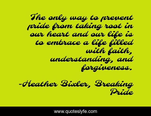 This page presents the quote "The only way to prevent pride from taking root in our heart and our life is to embrace a life filled with faith, understanding, and forgiveness.". Author of this quote is Heather Bixler, Breaking Pride. This quote is about faith, christian, inspirational-religious, understanding, pride, forgiveness,.