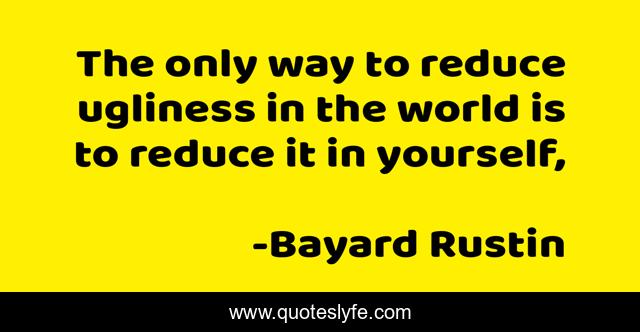 This page presents the quote "The only way to reduce ugliness in the world is to reduce it in yourself, ". Author of this quote is Bayard Rustin. This quote is about discipleship, self-criticism,.