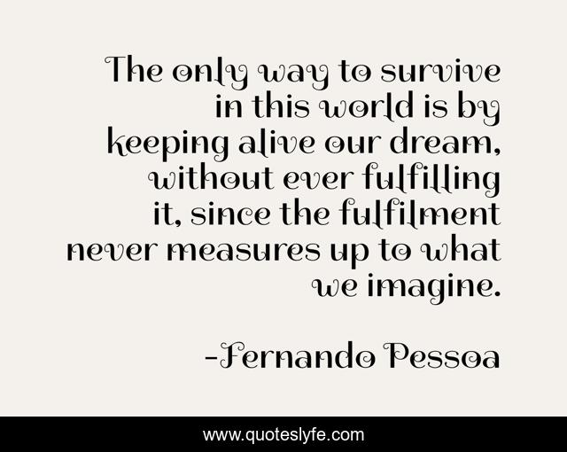This page presents the quote "The only way to survive in this world is by keeping alive our dream, without ever fulfilling it, since the fulfilment never measures up to what we imagine.". Author of this quote is Fernando Pessoa. This quote is about survival, dreamer, dreams-and-reality, dreams, reality,.