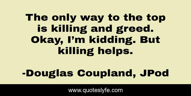 This page presents the quote "The only way to the top is killing and greed. Okay, I’m kidding. But killing helps.". Author of this quote is Douglas Coupland, JPod. This quote is about humor-inspirational, greed,.