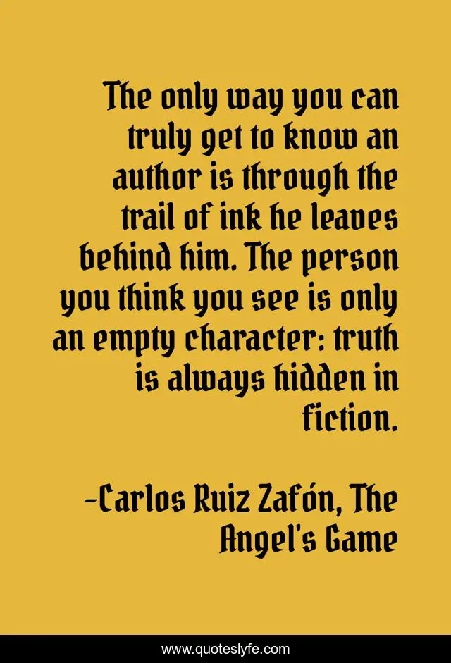 This page presents the quote "The only way you can truly get to know an author is through the trail of ink he leaves behind him. The person you think you see is only an empty character: truth is always hidden in fiction.". Author of this quote is Carlos Ruiz Zafón, The Angel's Game. .