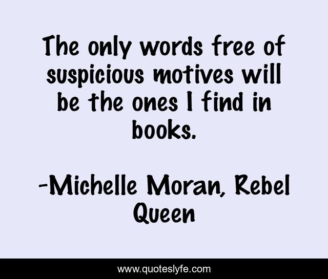 This page presents the quote "The only words free of suspicious motives will be the ones I find in books.". Author of this quote is Michelle Moran, Rebel Queen. This quote is about books, suspicion, words,.