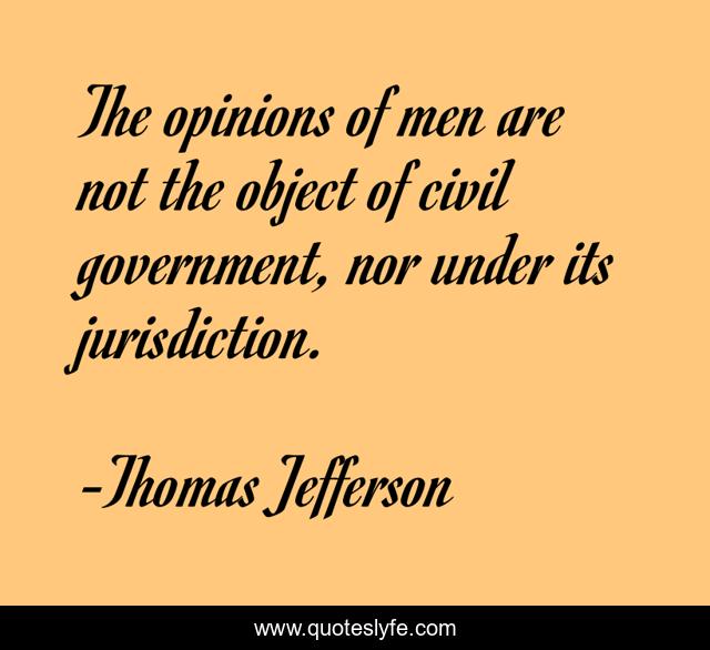 This page presents the quote "The opinions of men are not the object of civil government, nor under its jurisdiction.". Author of this quote is Thomas Jefferson. This quote is about opinions, government,.