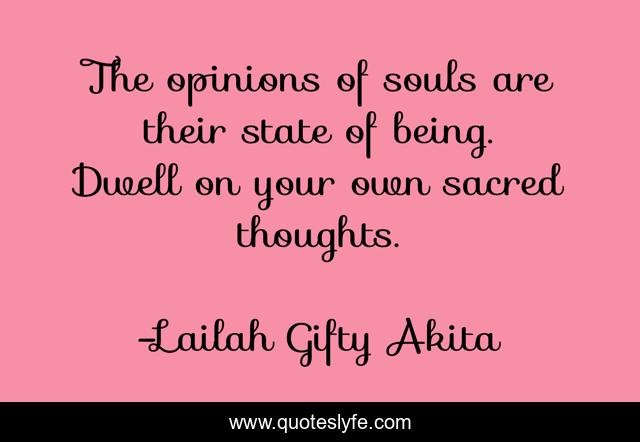This page presents the quote "The opinions of souls are their state of being. Dwell on your own sacred thoughts.". Author of this quote is Lailah Gifty Akita. This quote is about positive, advice, confidence, wise-thoughts,.