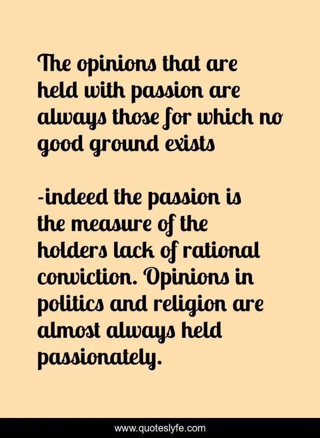 "indeed the passion is the measure of the holders lack of rational conviction. Opinions in politics and religion are almost always held passionately. Quotes." Quoteslyfe.com, 2025. Mon. 08 Dec. 2025. <https://www.quoteslyfe.com/quote/The-opinions-that-are-held-with-passion-92269>.