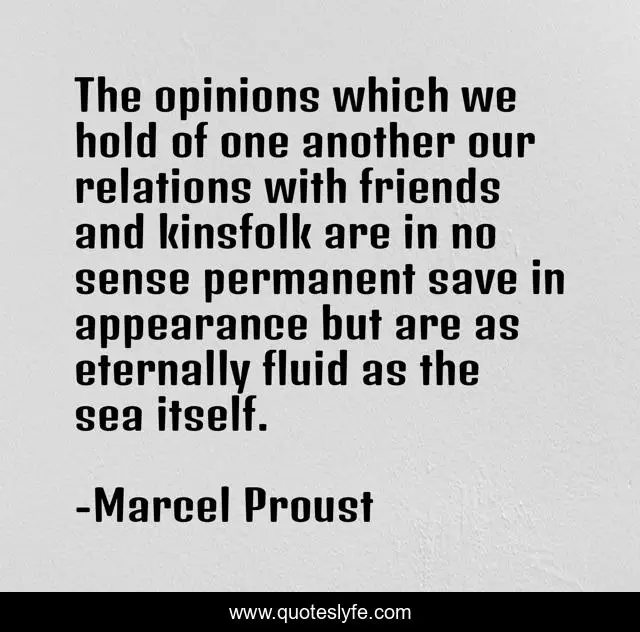 This page presents the quote "The opinions which we hold of one another our relations with friends and kinsfolk are in no sense permanent save in appearance but are as eternally fluid as the sea itself.". Author of this quote is Marcel Proust. This quote is about human, relations,.