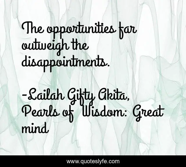"Lailah Gifty Akita, Pearls of Wisdom: Great mind Quotes." Quoteslyfe.com, 2025. Mon. 08 Dec. 2025. <https://www.quoteslyfe.com/quote/The-opportunities-far-outweigh-the-disappointments-185636>.