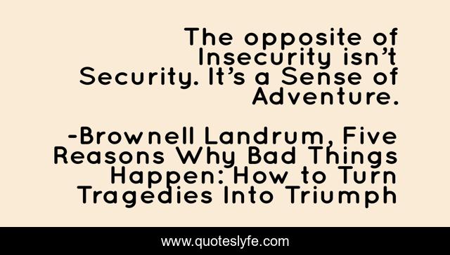 This page presents the quote "The opposite of Insecurity isn’t Security. It’s a Sense of Adventure.". Author of this quote is Brownell Landrum, Five Reasons Why Bad Things Happen: How to Turn Tragedies Into Triumph. This quote is about security, reasons-why,.