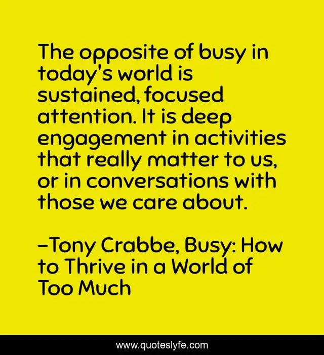 This page presents the quote "The opposite of busy in today's world is sustained, focused attention. It is deep engagement in activities that really matter to us, or in conversations with those we care about.". Author of this quote is Tony Crabbe, Busy: How to Thrive in a World of Too Much. This quote is about attention, focus, busyness,.