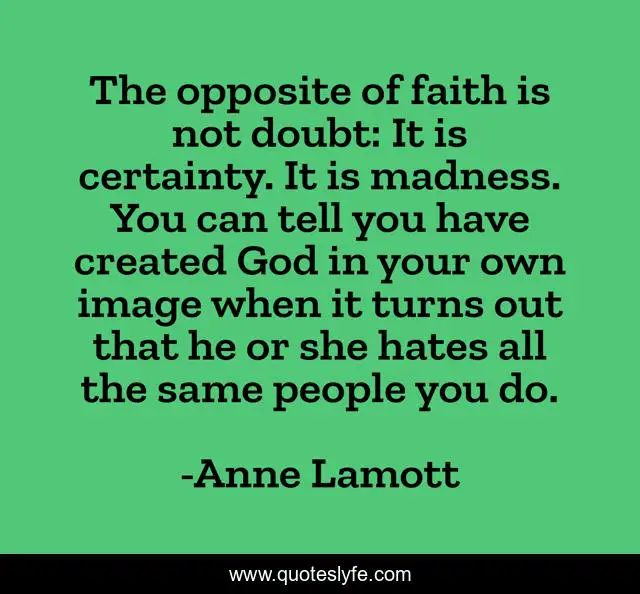 This page presents the quote "The opposite of faith is not doubt: It is certainty. It is madness. You can tell you have created God in your own image when it turns out that he or she hates all the same people you do.". Author of this quote is Anne Lamott. This quote is about god, doubt, people,.