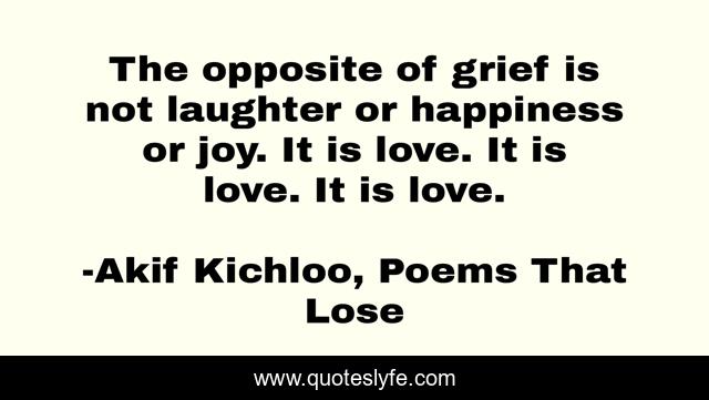 This page presents the quote "The opposite of grief is not laughter or happiness or joy. It is love. It is love. It is love.". Author of this quote is Akif Kichloo, Poems That Lose. This quote is about grief, love, grief-and-loss, affection, life-lessons,.
