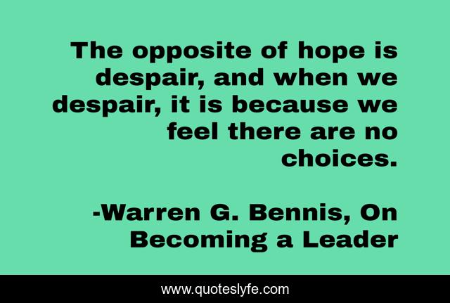 This page presents the quote "The opposite of hope is despair, and when we despair, it is because we feel there are no choices.". Author of this quote is Warren G. Bennis, On Becoming a Leader. This quote is about despair, hope, choices,.