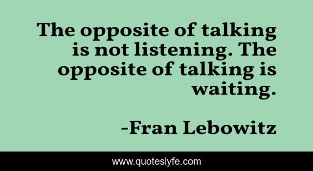 This page presents the quote "The opposite of talking is not listening. The opposite of talking is waiting.". Author of this quote is Fran Lebowitz. This quote is about politeness, manners,.